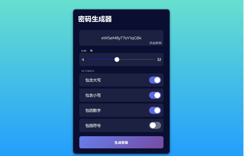 官网自营 源码模板 PHP源码 2021-10-27 03:34:45 随机密码生成器源码下载 演示站 开发语言:HTML JS随机密码生成器,密码长度可设置4-32位,密码可包含大写,包含小写,包含数字,包含符号,可一键复制密码