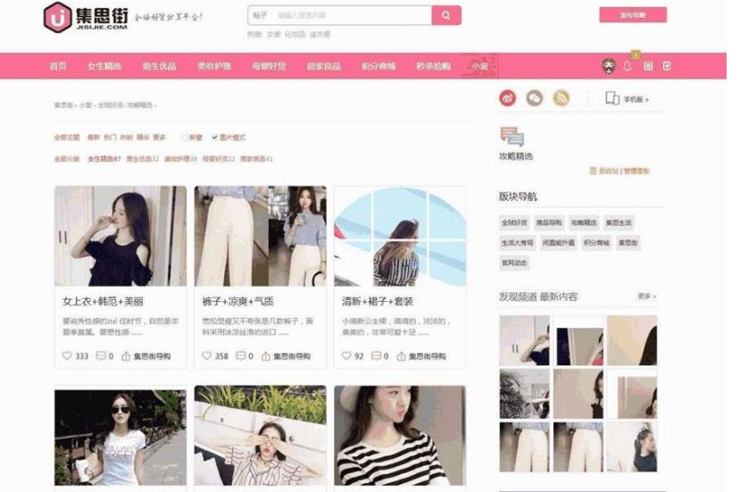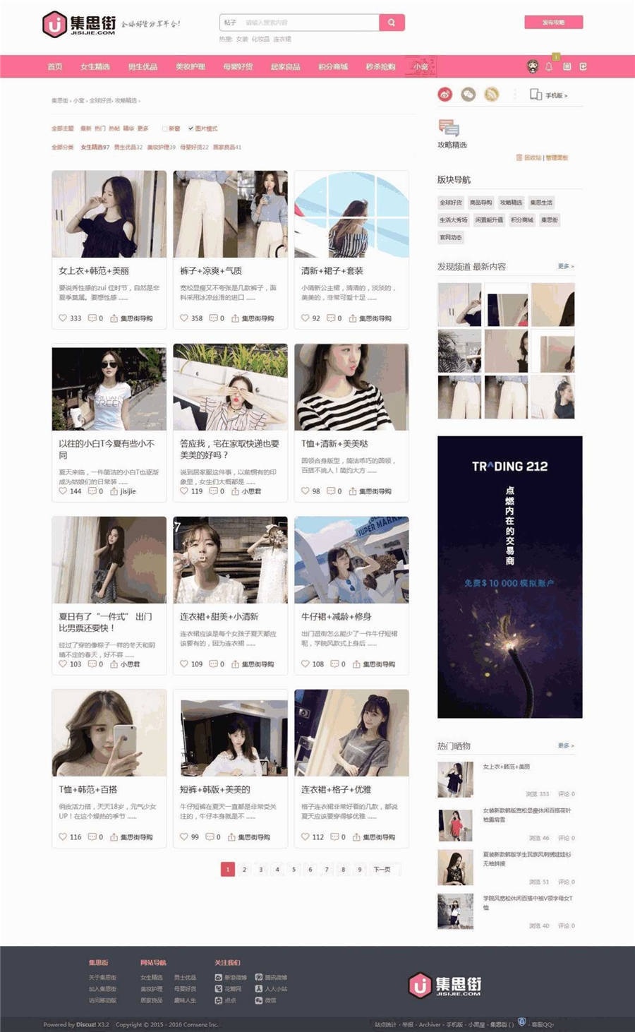 官网自营 模板专区 Discuz模板 2021-10-28 23:36:44 discuz集思街淘宝客模板 介绍: Discuz集思街淘宝客模板,采用DiscuzX3.2内核制作,模板代码优化完善,大气唯美,粉红色更贴合女性类的淘客商品推广。 运作的主要模式:主要通过文章形式链接商品进行淘客宣传。以短文,或软文方式能高效的提高,网站的内容质量从而在众多同行之中更好的体现出您的网站!