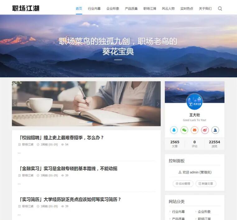 官网自营 源码模板 其他源码 2021-10-29 01:29:53 职场话题文章博客网站源码 简介: Z-BlogPHP职场话题文章资讯博客网站源码 带2000多条文章数据 安装说明: 1.常规操作,上传,安装 2.点击数据库插件,恢复数据 3.更新网站缓存,完成 后台: /zb_system/login.php 恢复完数据后的 账号密码 admin admin888