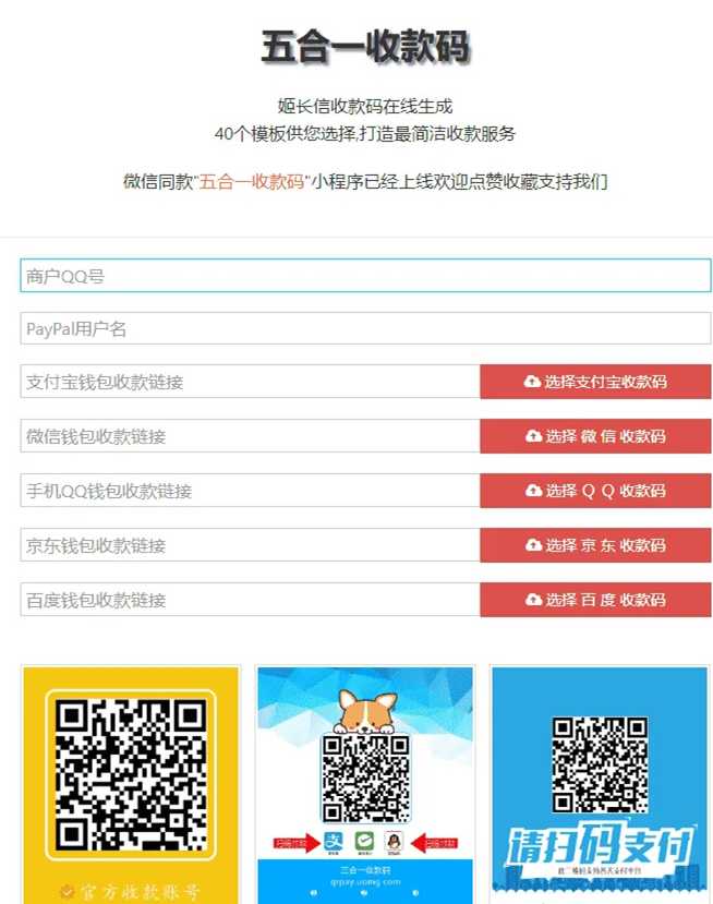 官网自营 源码模板 支付充值 2021-09-03 12:53:44 五合一收款+HTML单页版多模板免安装 五合一收款码在线生成,40个模板 支持微信支付、支付宝支付、手机QQ支付、京东钱包、百度钱包,PayPal五合一收款,将其二维码合并为一个二维码,无需手续费,支持qq头像,昵称判断(HTML单页版多模板免安装)
