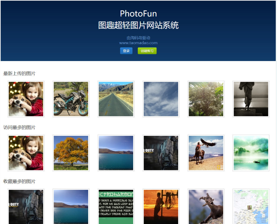 PhotoFun-图趣是一款由淘码岛出品的超轻图片网站系统。PhotoFun-图趣最大的特点就是轻量级,整个系统的源码文件所占空间不到2MB(演示数据除外),所以“超轻”由此得名。