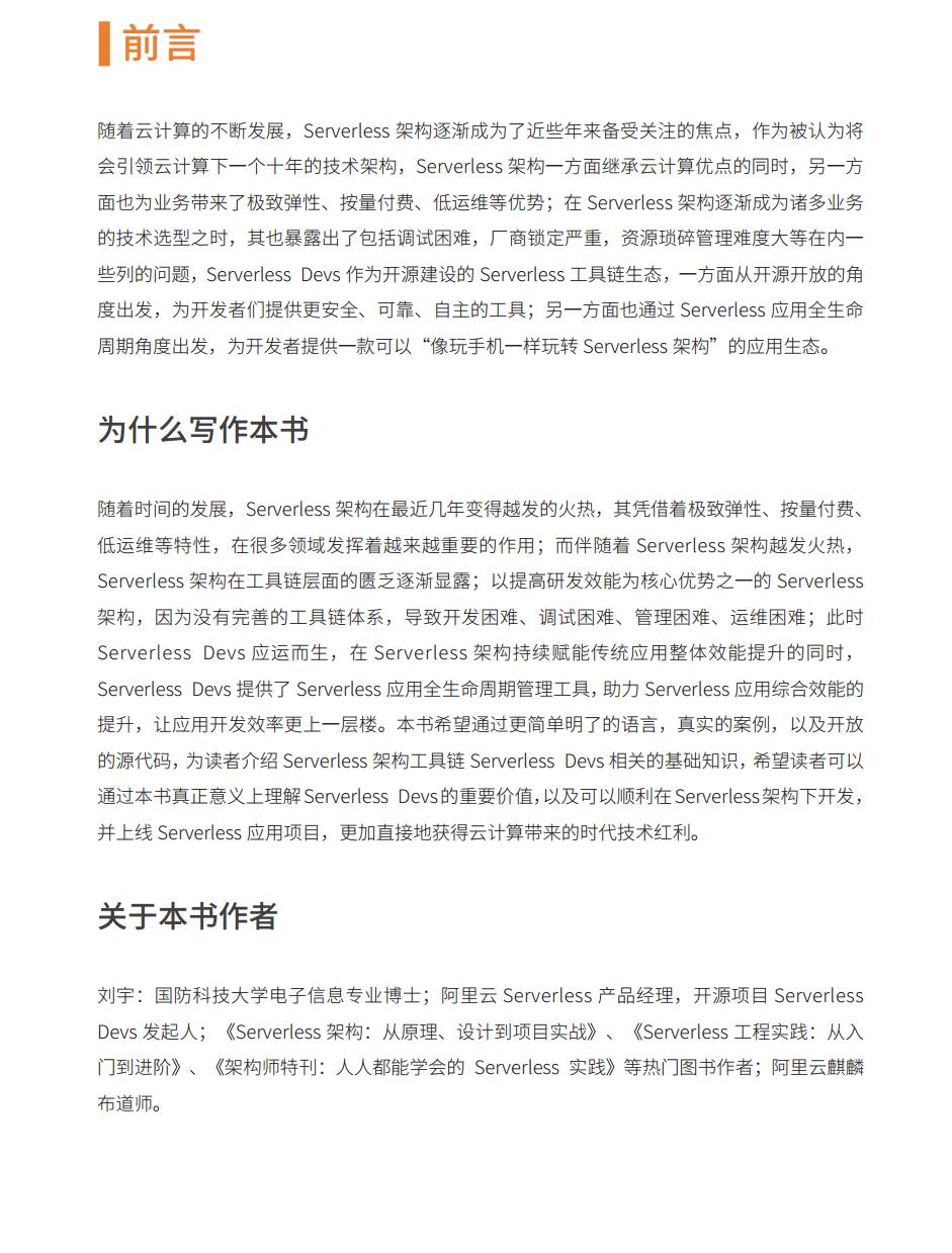 这是一本关于 Serverless 开发者工具助力 Serverless 应用研发效能提升的手册,一共有 5个章节,通过这 5 个章节读者可以从 Serverless 架构以及 Serverless Devs 开发者工具的基础入门,通过快速入门案例,在AI 领域下的应用,在 CI/CD 中的实战案例,等多个维度进行学习和了解 Serverless Devs 开发者工具。