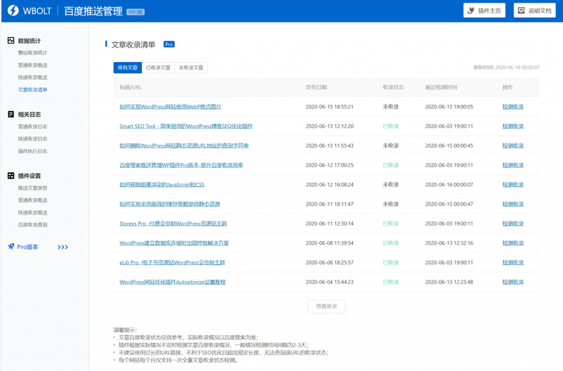 百度收录查询-启用该功能后,插件将会在文章列表新增已发布文章百度收录检测及百度收录状态展示,