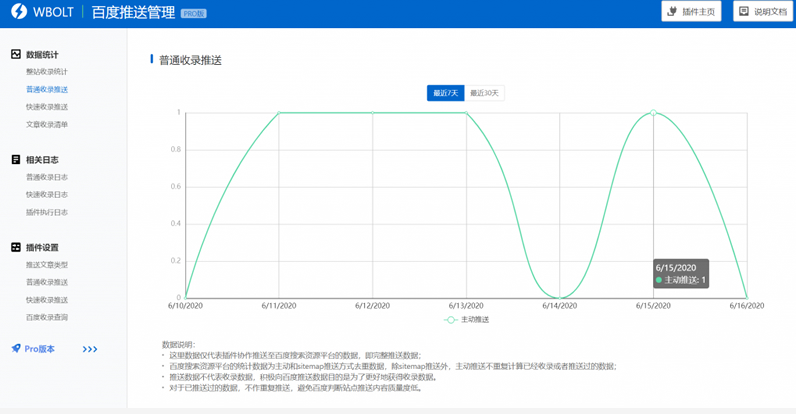 基础推送-支持快速查看百度搜索资源平台自动与自动推送两种方式连接提交的最近7天&30天的推送数据走势。
