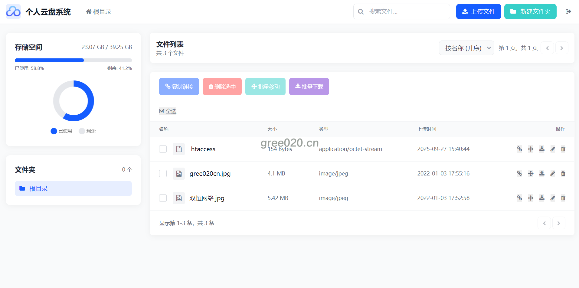 官网自营 源码模板 下载/上传 2025-09-27 15:48:42 个人云盘存储系统源码 轻量化个人云盘系统源码 PC+H5自适应图床功能、文件外链、文件夹操作、文件上传与管理等全方位功能助力个人高效管理云盘资源 自适应pc和手机端 安装教程: 上传即可使用,账号admin密码:gree020.cn